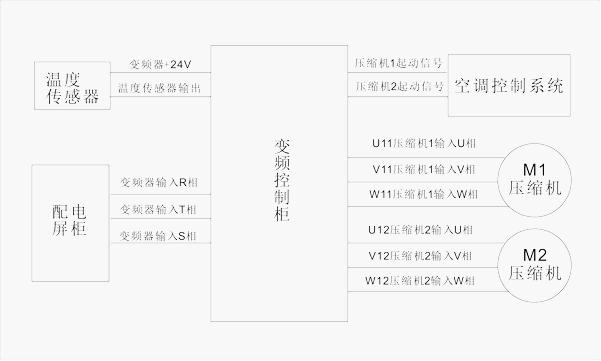 b 變頻器的起動(dòng)和停止信號(hào)由控制控制系統(tǒng)的PLC來(lái)給定,變頻器的輸出直接控制空調(diào)壓縮機(jī)。