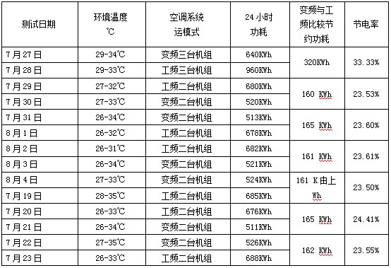 根據(jù)廣東省全年平均氣溫分布情況,測(cè)試階段選擇在全年環(huán)境平均溫度最高的時(shí)間,平均大約是30℃,空調(diào)機(jī)組的運(yùn)行效率是在93%以上,即節(jié)能效果最差的時(shí)間段進(jìn)行測(cè)試,運(yùn)行測(cè)試數(shù)據(jù)如下表: